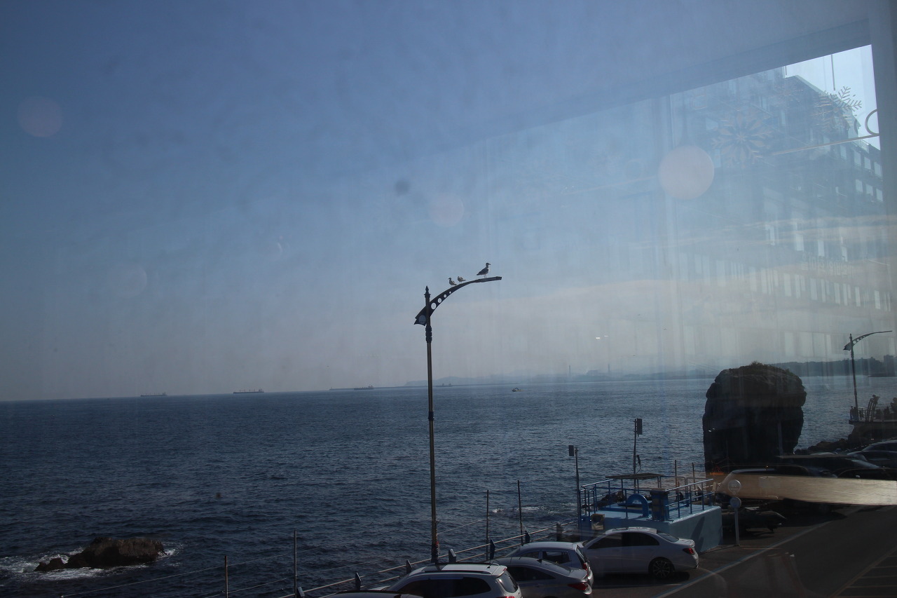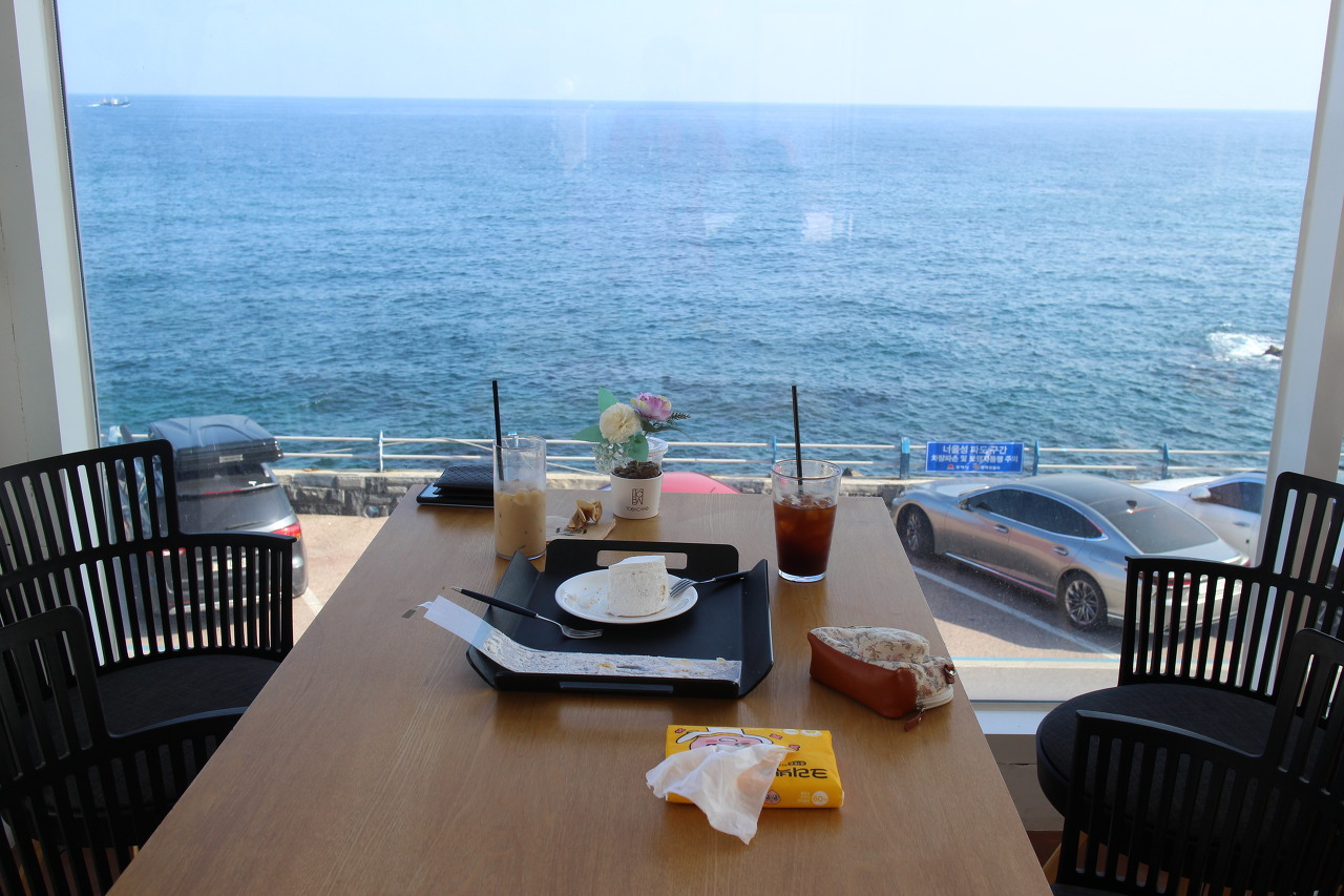 운이 좋아 창 옆에 앉을 수 있었는데요. 계단을 올라와서 창 옆 왼쪽 끝자리에 앉았어요. 탁 트인 바다를 볼 수 있었고 한동안 앉아서 커피와 케익을 먹으면서 바다를 구경 했어요.