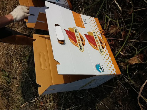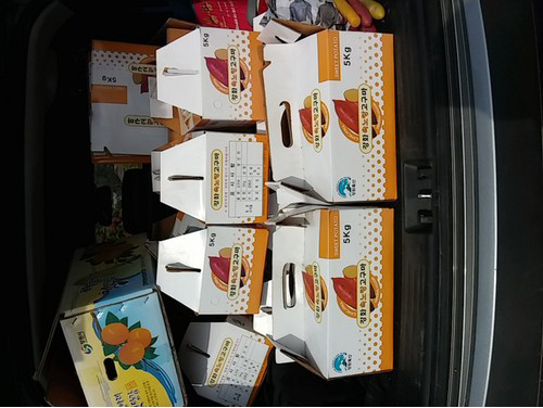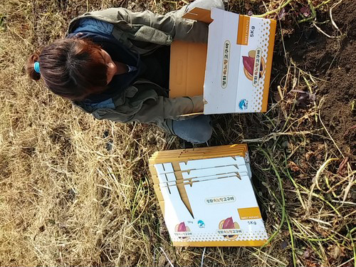 다 캔 고구마를 5k짜리 고구마 박스에 옮겨 담아 차에 실고 사진 찍었네요.