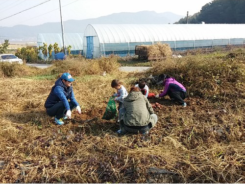 조카들과 가족들이 열심히 고구마를 주워 담고 있네요.