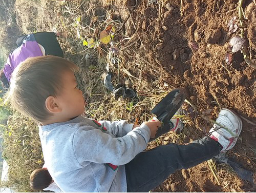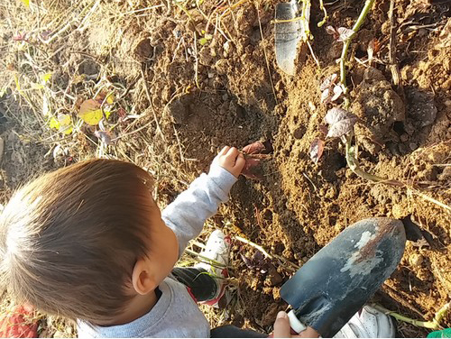 어린 조카가 땅 속에서 큰 고구마를 발견하였네요. 삽으로 캐려고 하다가,