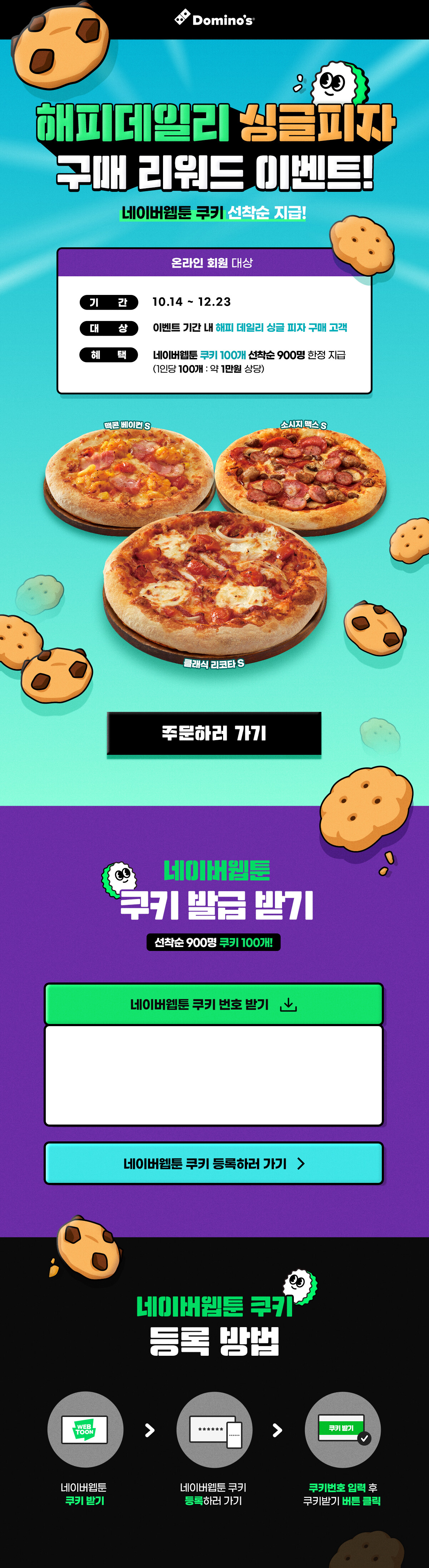도미노피자 네이버 웹툰 쿠키 지급이벤트입니다. 이벤트 기간 내 해피 데일리 싱글 피자 구매 고객 선착순 900명에게 네이버 웹툰 쿠키 각 100개를 지급합니다. 혜택은 선착순 지급이며 ID당 1회 한하여 발급합니다. 해당 쿠키는 등록시점으로부터 90일간 사용할 수 있습니다.