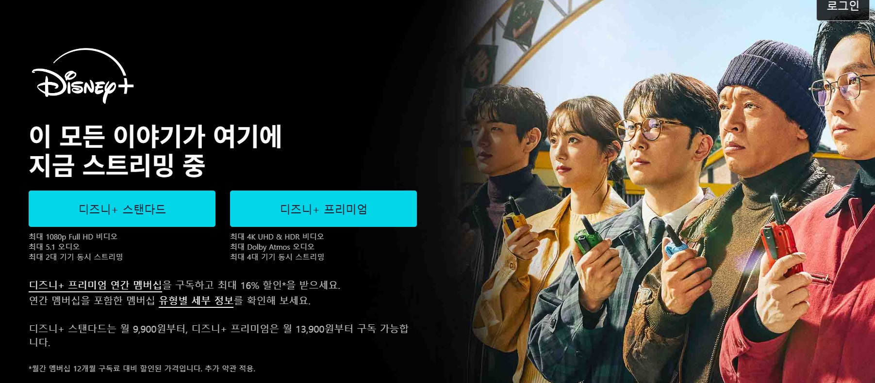 - 디즈니+ 스탠다드(부가세 포함): 월 ₩9,900 / 연 ₩99,000