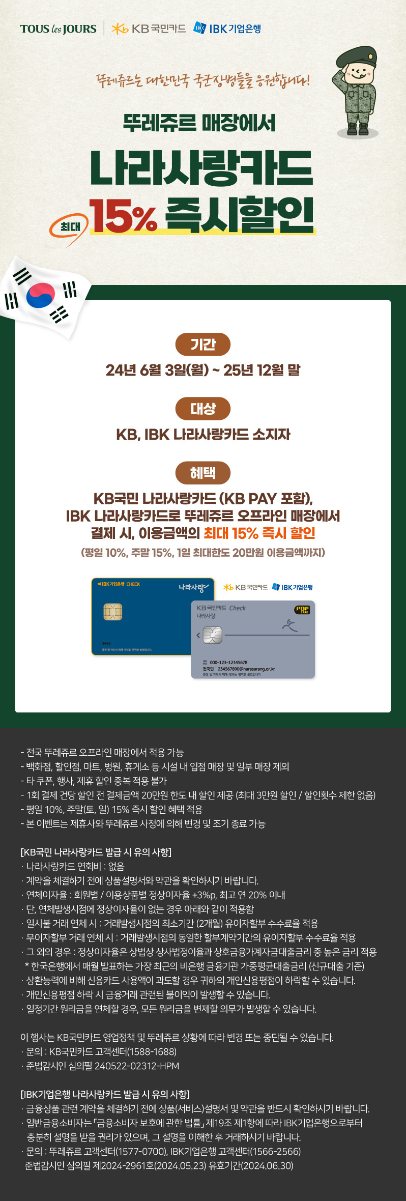 KB국민 나라사랑카드 (KB PAY 포함), IBK 나라사랑카드로 뚜레쥬르 오프라인 매장에서 결제 시 이용금액의 최대 15% 할인