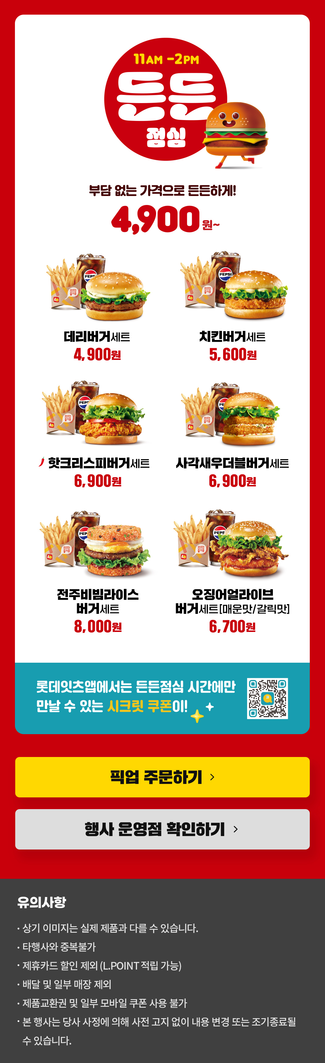 롯데리아 할인 '든든점심' 메뉴 및 가격 (오징어 얼라이브버거, 사각새우 더블버거, 전주비빔라이스버거 외)