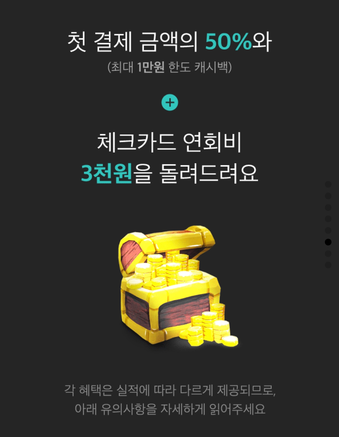 첫 결제 금액의 50%(최대 1만원 한도 캐시백)와 체크카드 연회비 3천원 돌려주는 혜택 제공