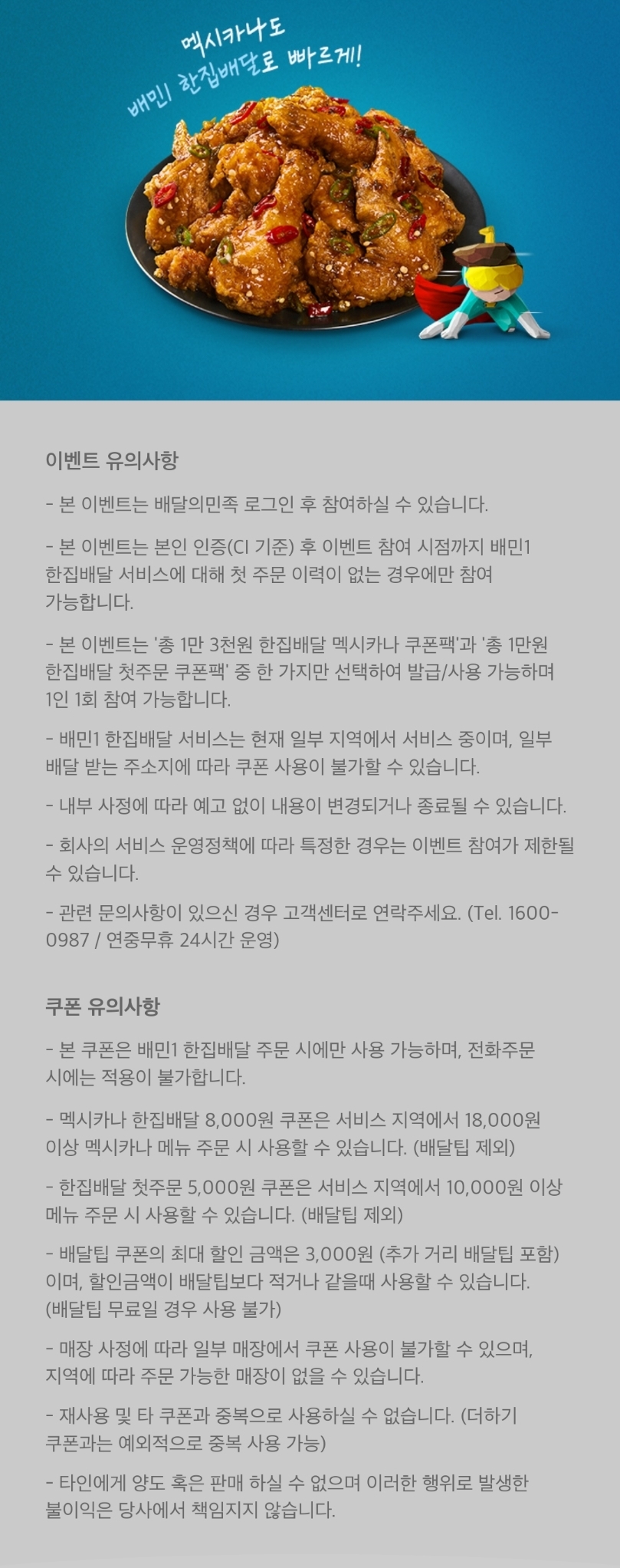 ※배민1 한집배달 서비스는 일부지역에서 서비스 중이며, 일부 배달 받는 주소지에 따라 쿠폰 사용이 불가할 수 있음
