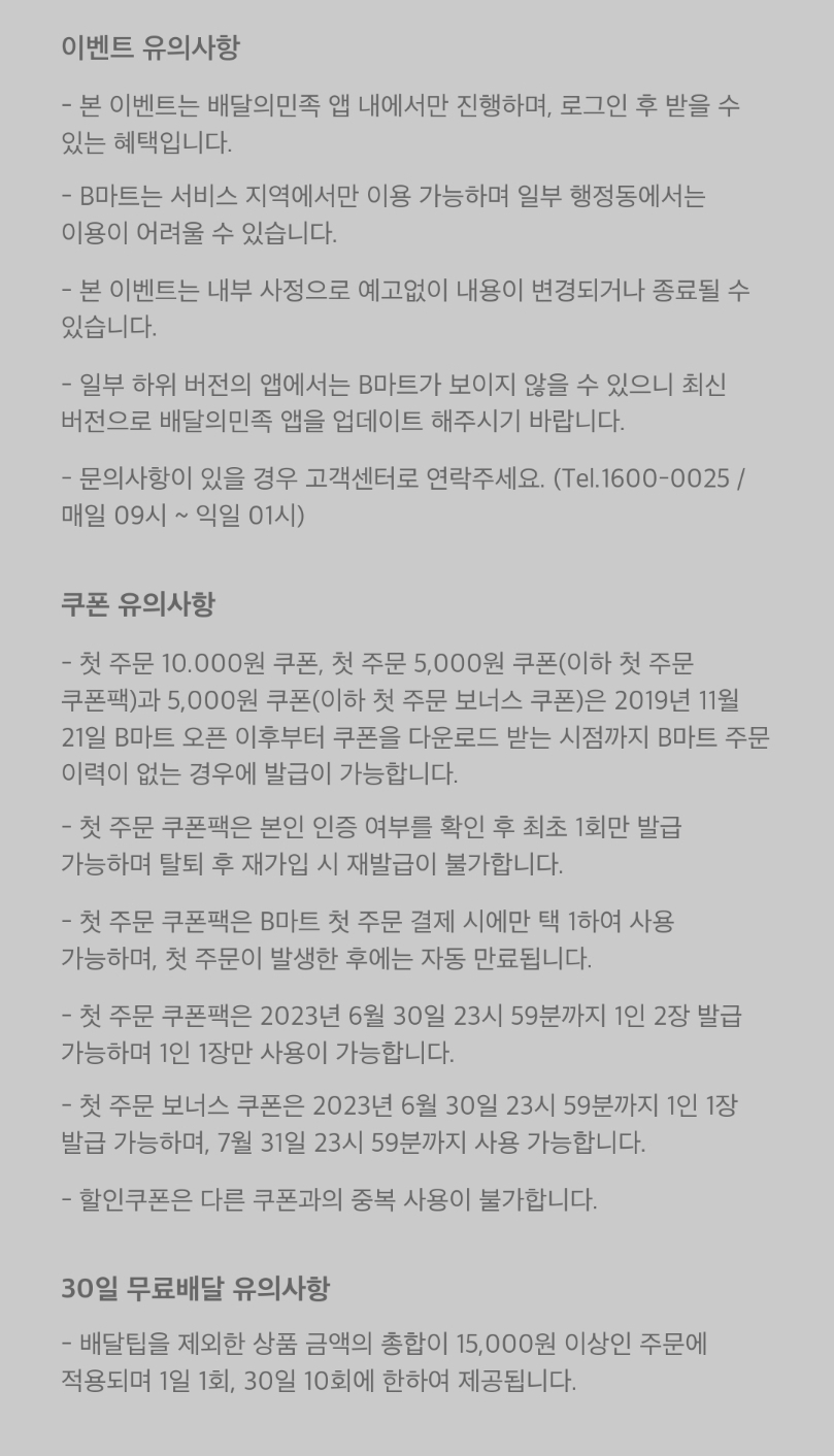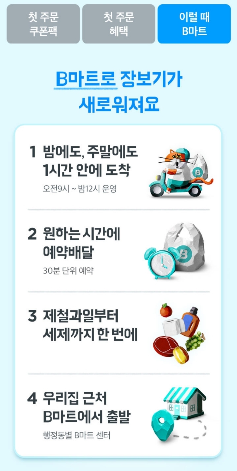 ※B마트 첫주문 쿠폰은 2019년 11월 21일 B마트 오픈 이후부터 쿠폰을 다운로드 받는 시점까지 B마트 주문 이력이 없는 경우 발급 가능
