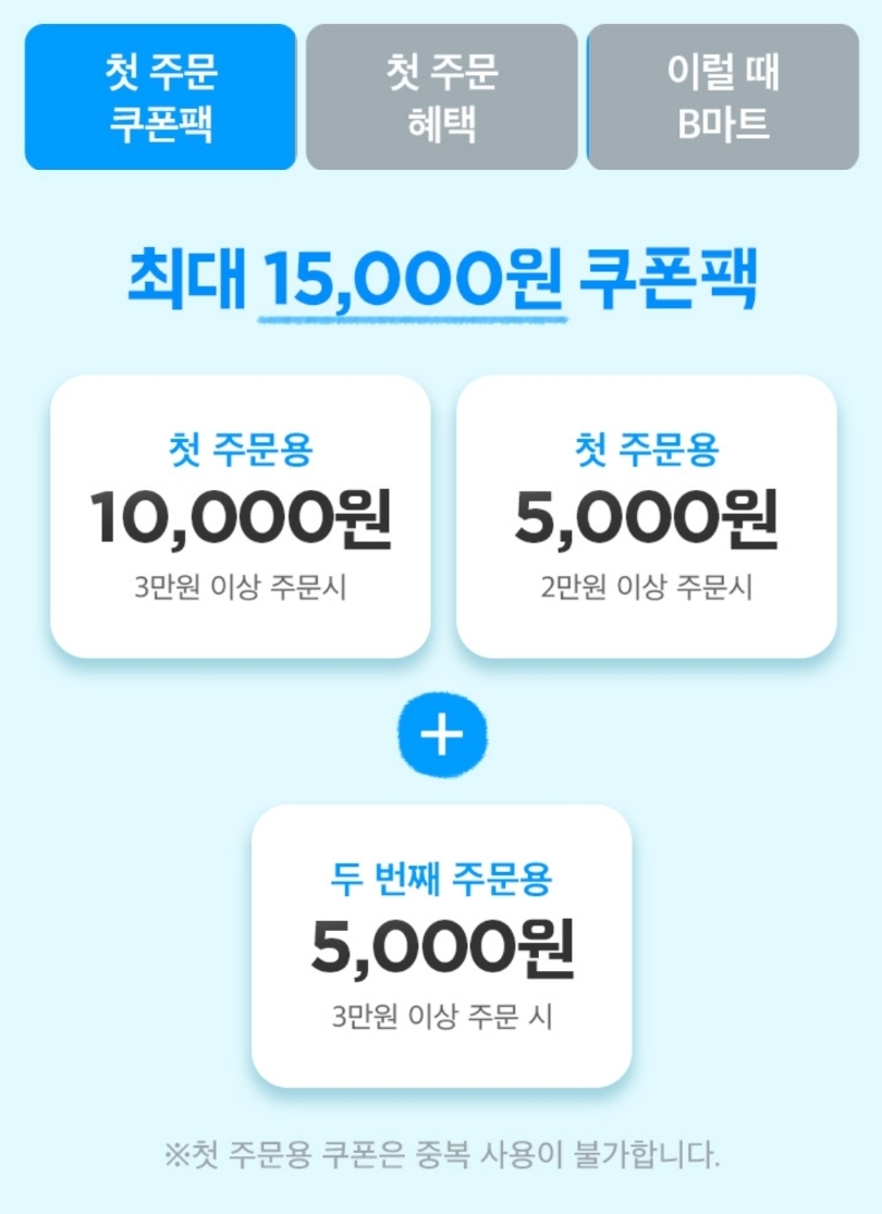 배달의민족 배민 B마트 첫구매 할인 쿠폰, 100원 특가, 무료배달 쿠폰 증정 이벤트 배민 B마트 할인 쿠폰, 100원 특가 이벤트 첫주문 최대 15,000원 할인쿠폰 증정 - 첫주문용 1만원& 5천원 쿠폰(각각 3