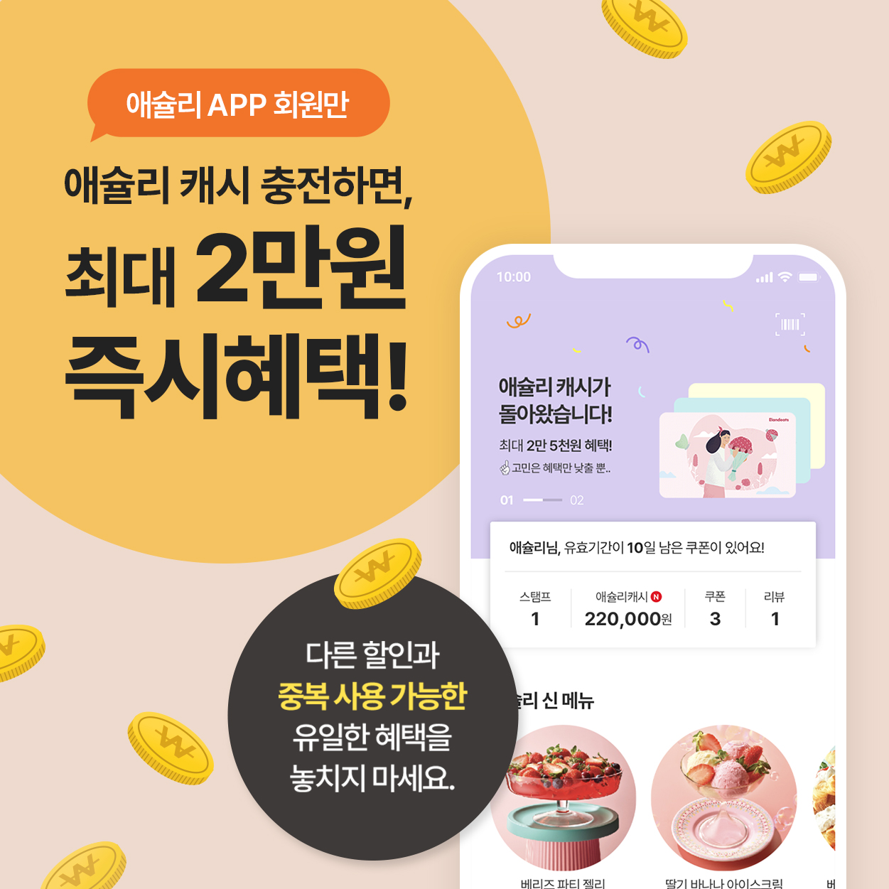 현재 애슐리 앱 회원에 한해 캐시 충전 시 최대 2만원 즉시 혜택 이벤트가 진행중이예요. 다른 할인과 중복 할인이 가능하며 애슐리 패밀리 브랜드 및 온라인 마켓 ‘홈스토랑’에서도 사용 가능해요.(자연별곡, 피자몰, 로운, 리미니, 스테이크어스 등 직영매장에 한함)