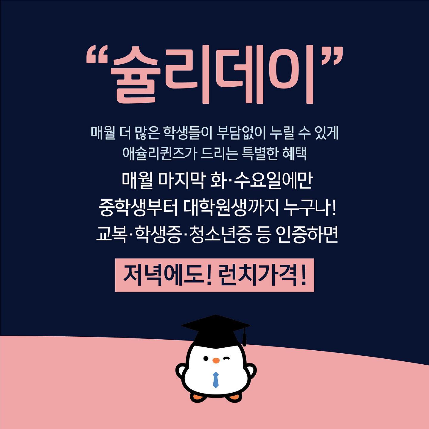 만약 학생이라면 매월 마지막주 화·수는 하루종일 런치 가격으로 이용할 수 있어요. 학생증, 교복, 재학 증명서 등으로 인증하면 되고 여의도한강공원점, 켄싱턴내 입점 매장 제외한 애슐리 전 매장에서 혜택 받을 수 있어요.