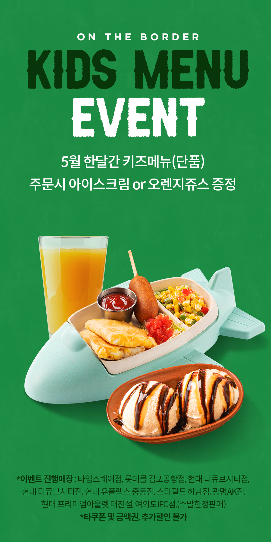 5월 한달간 키즈메뉴(단품) 주문 시 아이스크림 또는 오렌지쥬스 증정