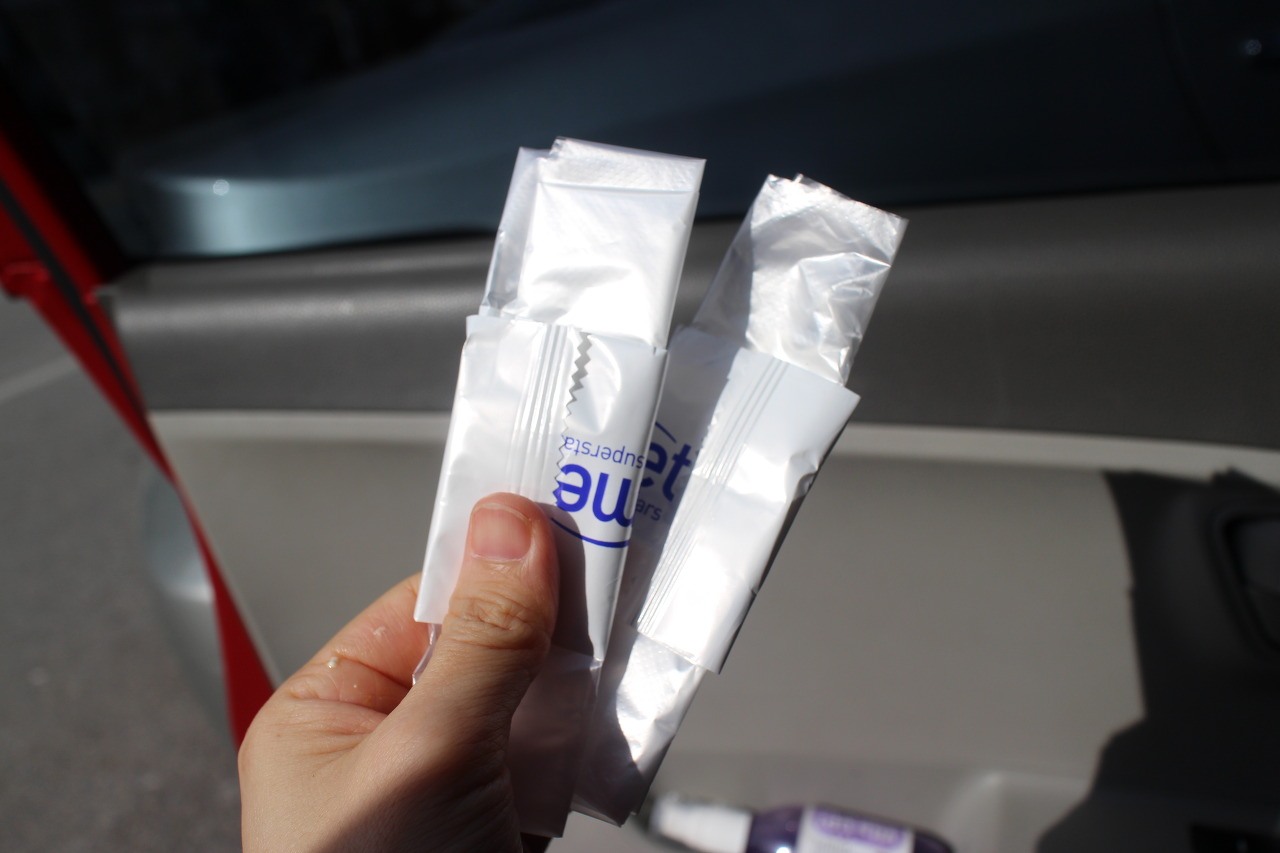 와플을 먹다가 비닐장갑과 물티슈가 들어있는 걸 발견했어요. 근데 이미 다 묻히고 흘리고 난 뒤였어요. ㅠㅡㅠ