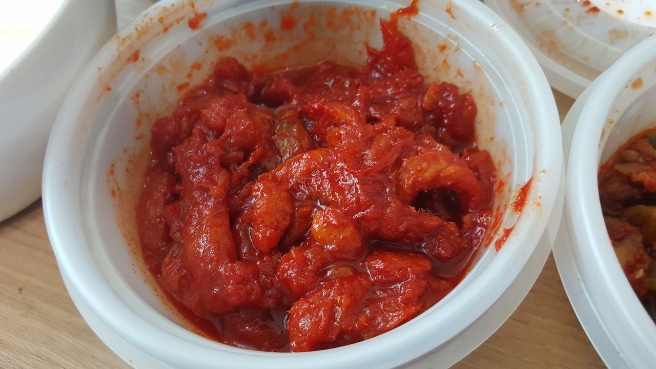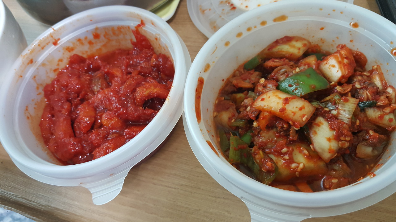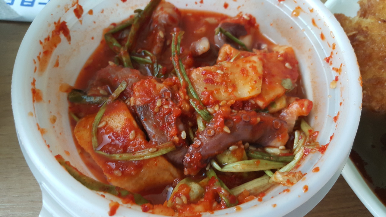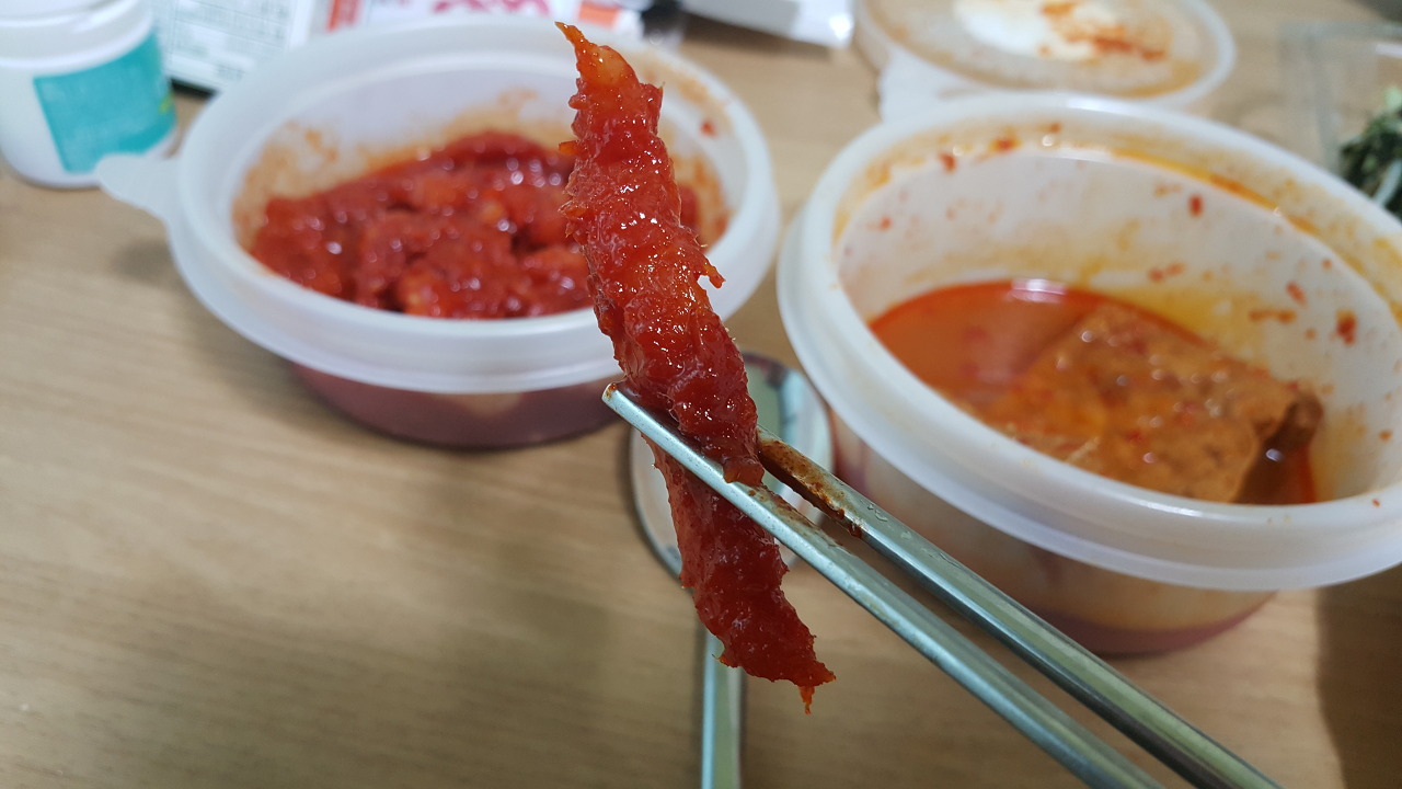 낙지야채 초무침, 오징어고추장 진미채예요. 낙지 양이 많진 않지만 낙지가 질기지 않고 적당히 잘 삶아졌고 새콤하니 괜찮았어어요. 진미채는 단짠으로 맛있었구요. 엄마가 집에서 해주는 느낌 난 반찬이었네요.ㅎㅎ