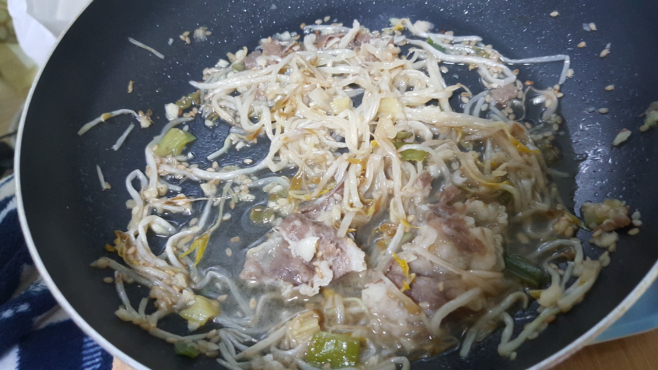 숙주 차돌박이 볶음이예요. 반 정도 데우는 모습인데 차돌박이가 많지는 않았어요. 반찬으로 두 세점 먹을 수 있는 정도. 맛은 괜찮았고요.