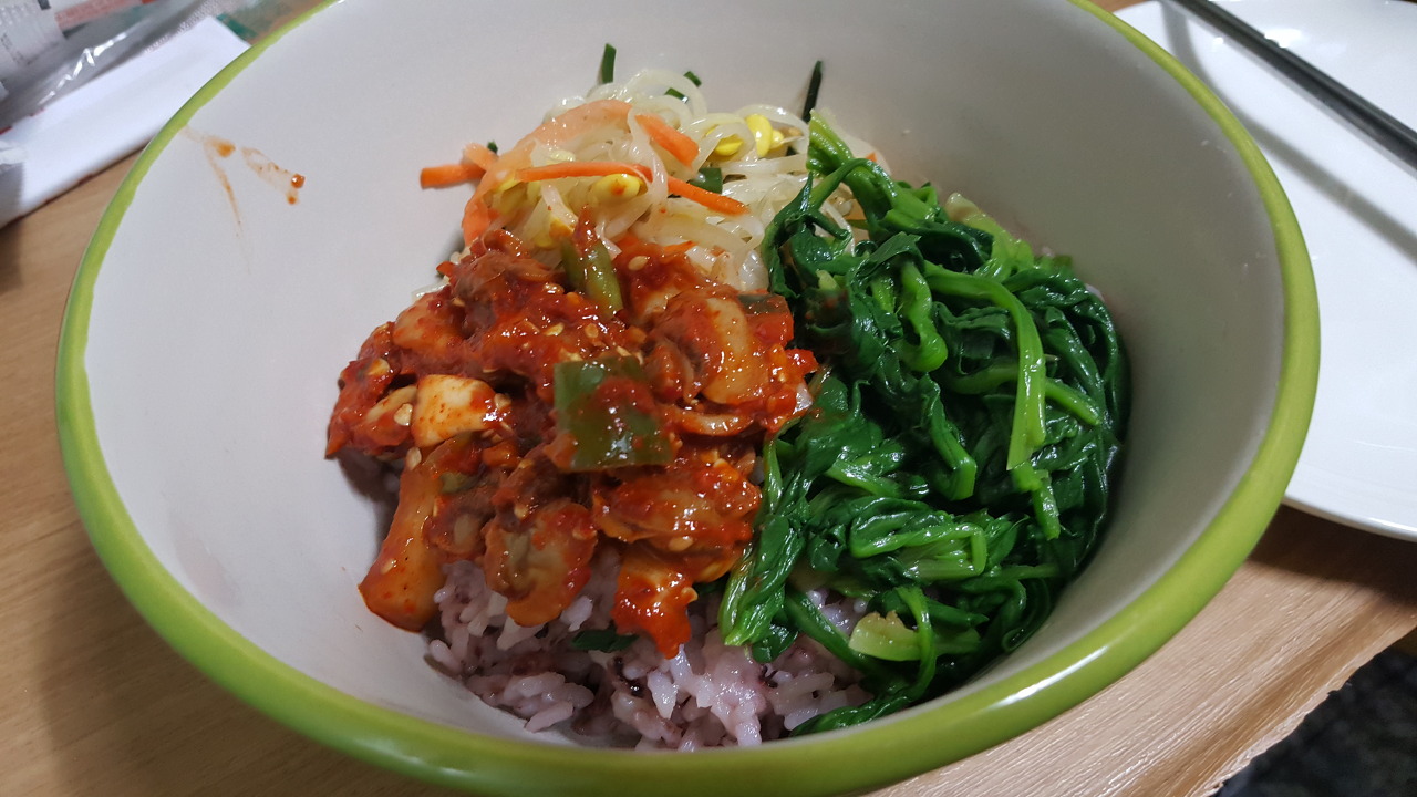 꼬막야채 간장무침은 야채도 꽤 많이 들어있어서 비빔밥 해먹으면 맛있을 것 같더라구요. 시금치랑 콩나물 간단히 무쳐서 비빔밤을 해먹어봤어요. 참기름 좀 넣고 비벼먹었는데 너무 맛있었어요.