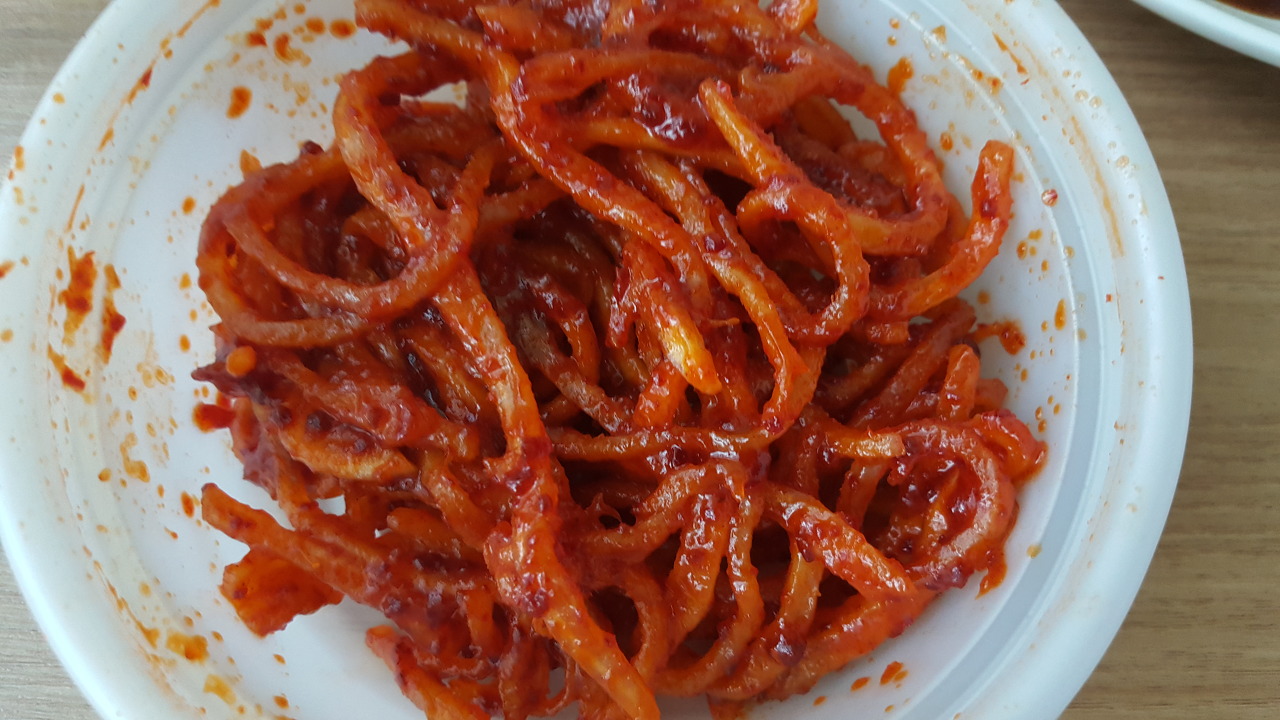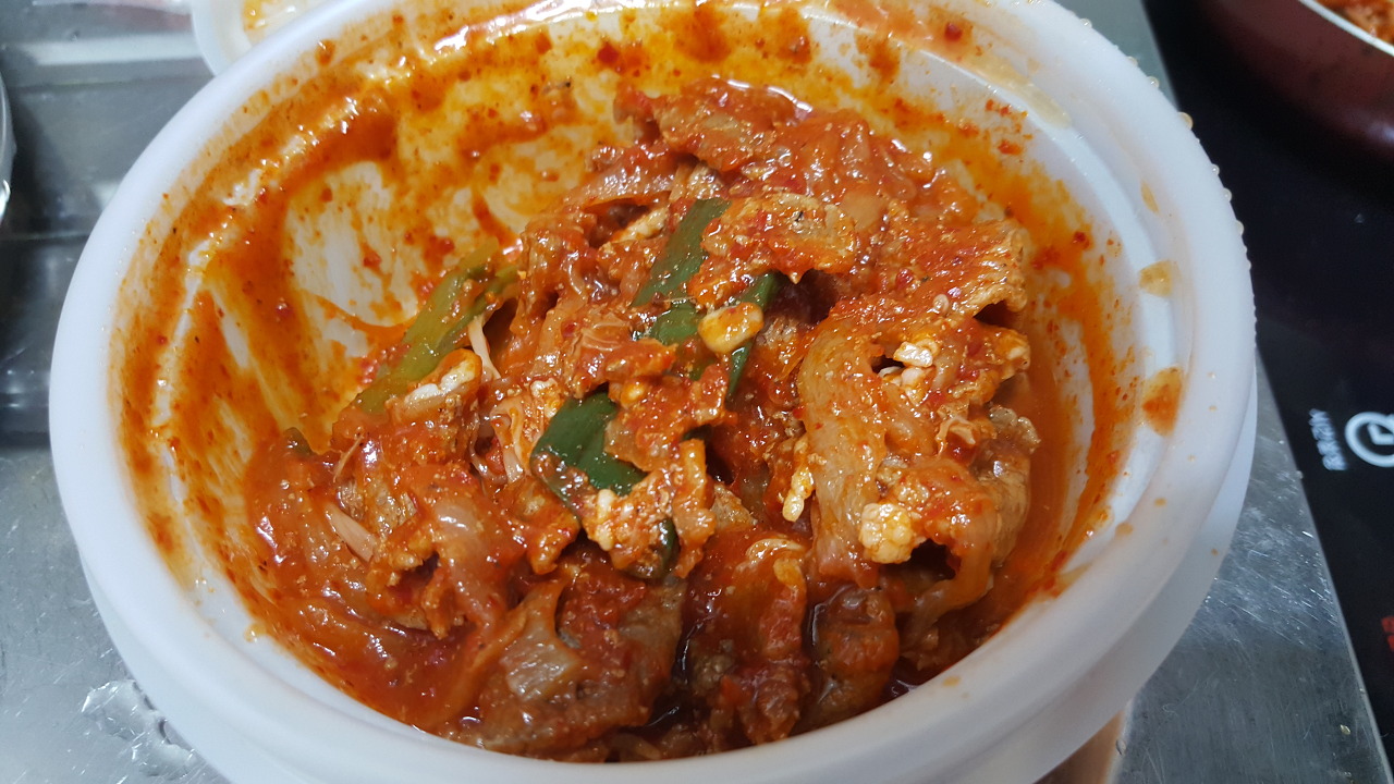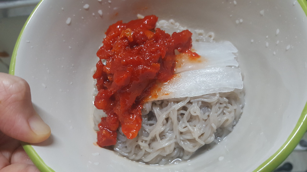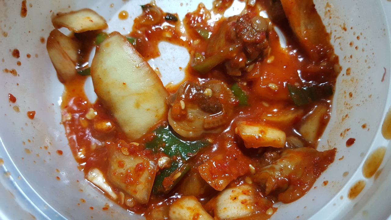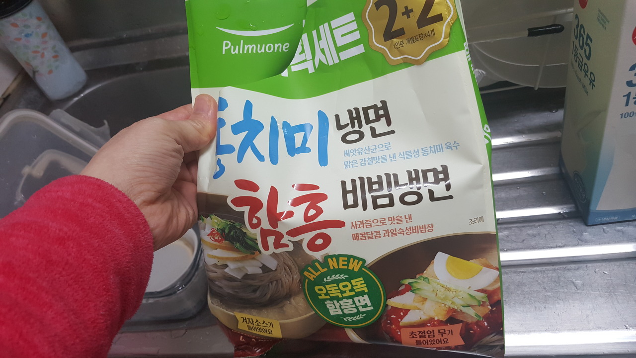 명태회무침과 꼬막야채 간장무침인데요. 명태회는 마른 명태로 만든 것 같았어요. 맛은 간간하니 먹을 만했구요. 먹다가 갑자기 회냉면이 생각나서 다음날 슈퍼에서 냉면 간편식 사다가 회냉면을 만들어 먹었어요. 명태회가 간이 되어있어서 비빔냉면 소스는 반만 넣어서 먹었어요. 그래도 조금 짰어요. 간은 소스를 조금씩 넣어서 먹어보면서 맞춰서 먹어야 할 것 같아요. 아무튼 별미로 먹기 괜찮았어요.
