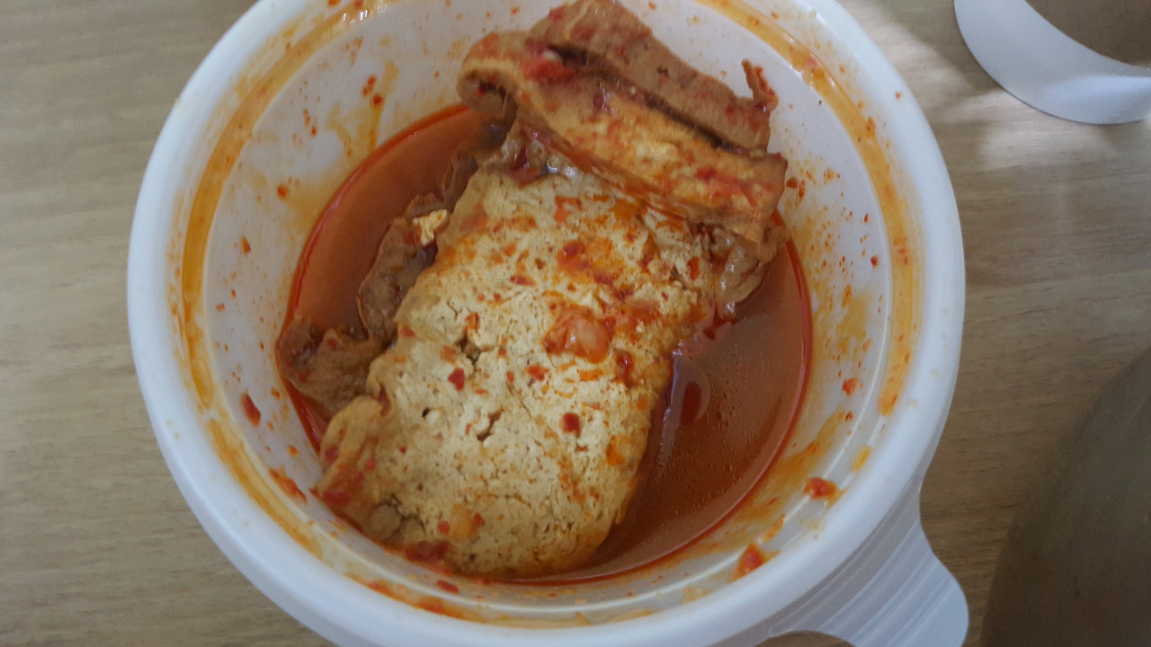 두부조림이예요. 반찬들 중 제일 별로(?) 였는데 맛 자체는 나쁘지 않았는데 기름에 튀겨서 양념을 해서 그런지 가장자리가 쫀득한 식감이였어요. 전체가 부드러운 두부조림이 더 좋을 것 같아요.